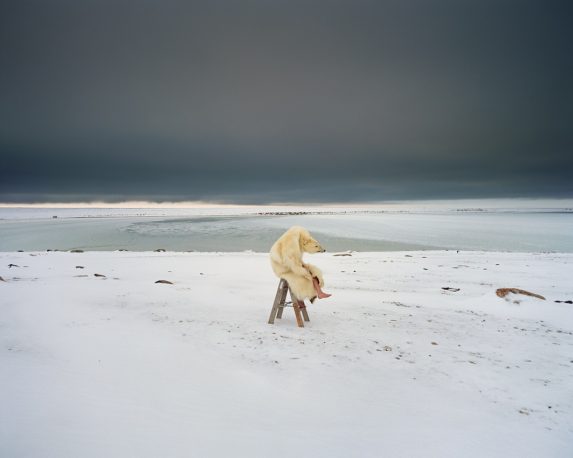 Polar Bear, 2007. Wrapped in a polar bear fur, this woman braves a temperature of -25 °C. Frivolously, she even sticks out a bare leg. Several ideas come together here, as they often do with Scarlett Hooft Graafland. “I spent a long time with the Inuit on the Canadian Arctic Circle and experienced the suffering that the weakening of the ice due to climate change causes for humans and animals. This is simultaneously a self-portrait – in which the tip of my nose froze – and a statement about deteriorating living conditions.”