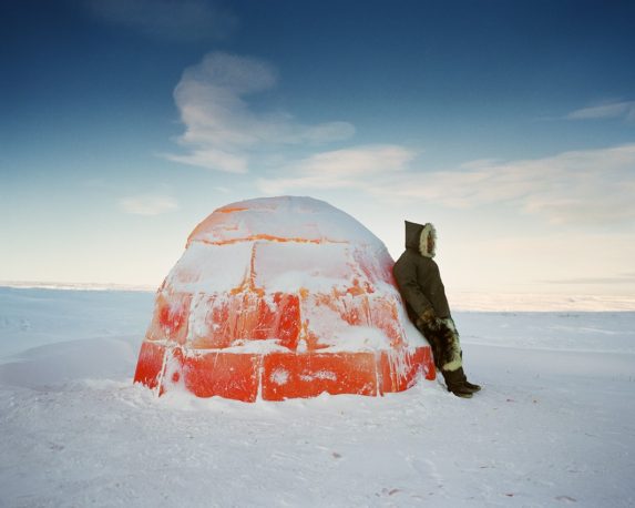 Lemonade Igloo, 2007. A generation gap in images: the Inuit leaning against the newly built igloo in his traditional wolf outfit is one of the last to master the craft of making an ice hut. “The youth sit behind the computer and drink lemonade. The older generation in the village of Igloolik is able to survive in the Arctic and holds on to a more traditional way of life. Together with this man, Nathan Qamaniq, I built the igloo from blocks of frozen lemonade.”