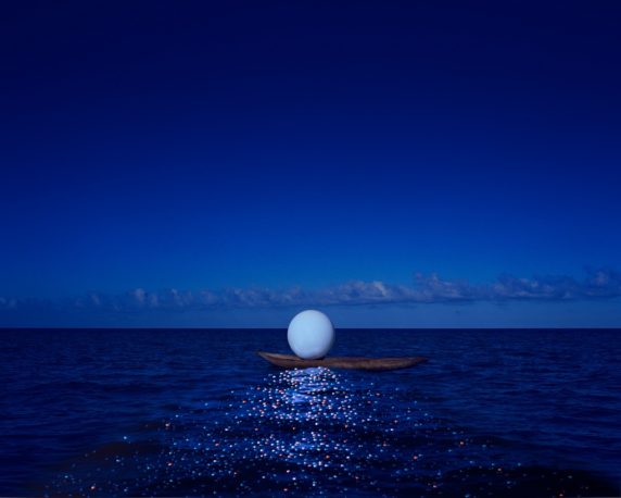 Farewell my Freeman Friend, (2013 – 2025). A white ball slowly drifts away on a canoe in the Indian Ocean, west of Madagascar, where the sun has already set. “An ode to Jacqueline Hassink (1966 – 2018), my late art companion and best friend.” She created this work especially for this exhibition. This image is enriched with embroidery and is illuminated by dynamically moving light – a first. ‘I have really taken a new step in my work with this. By adding this extra dimension, even more movement is created in the work. It is as if a magic wand is waving over the artwork’, she says.