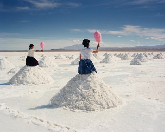 Sweating Sweethearts 2, 2004. These Aymara women from the Bolivian Andes were only allowed to participate in photo shoots with their husbands’ explicit permission. As a silent protest against the macho culture, Scarlett Hooft Graafland placed them on a pedestal: salt mountains, raked together by the same men during the salt extraction. The women’s sweet cotton candy refers to the way they are addressed in that region: sweethearts. Posing breaks the routine: the women enjoyed it and could not suppress a smile.