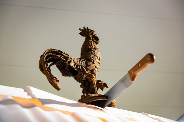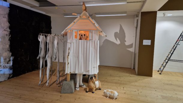 The second installation is a house. It consists of a fragile construction of a house made of white paper in the form of corrugated iron, with a grate on the roof and a machete that cuts halfway through the house. The whole thing stands on four legs, one of which is supported by a ceramic ram, a white pig looks at the ram. Inside the house is a figure, it is enclosed and immobile, a representation of enclosed identity, survival and pressure, a refugee. It is called ‘Roost, Ram and Refuge’. Inside I see more animals and objects, including a small person in a fetal position in a glass jar. “Sometimes you have to suppress a small part of yourself.” To the left of the house hangs a clothes rack with laundry in the form of bodies. “It shows the vulnerability, the instability of the house. To survive, you need frameworks around you. The machete on the roof marks a moment of tension: it can be a protective symbol, as well as a reference to rupture or necessary action. The object balances between strength, resistance and control, a sign that everything that is fragile must also be able to be defended or cut through. The work also invites viewers to make their own associations and stories.” Body bags hang behind the house. “Those body bags represent saying goodbye to certain elements, Kill your darlings. You have to let go of certain things if you want to move on.”