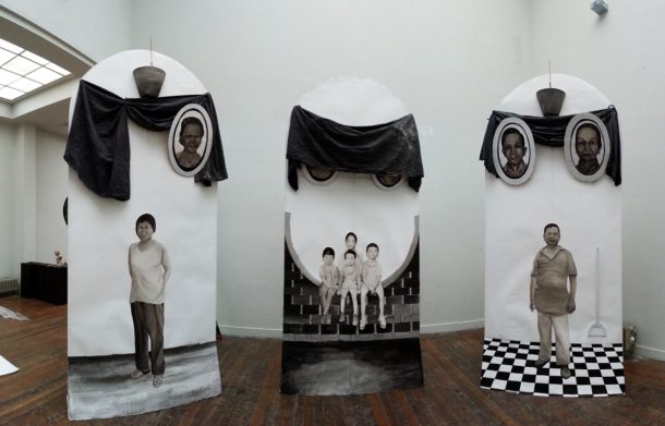 He does. It is the monumental triptych installation consisting of three large panels, each covered with a white background on which drawings in Indian ink can be seen of family members. Combined with portrayed ancestors at the top of each panel, partly covered with black cloths and incense as a reference to commemoration rituals. The installation investigates how family history, loss and identity are interwoven and the confrontation with your own future and your own decision. In one of the works it is an installation of a facade of a house, constructed from reused and discarded materials, weathered wooden planks, an old door and a window with red curtains. Ivy winds its way up between the planks. In the middle sits the artist himself, placed between the open door. The back of the work reveals a different reality than the constructed facade on the front. What first looked like a house, here reveals itself as a fragile construction of white cement blocks, partly broken open with a red wall of wallpaper that is suddenly exposed. The wall is not finished, it crumbles as if something from the inside is trying to break outwards or vice versa, which is an imagination of the future. These works are all a form of a self-portrait of the artist.