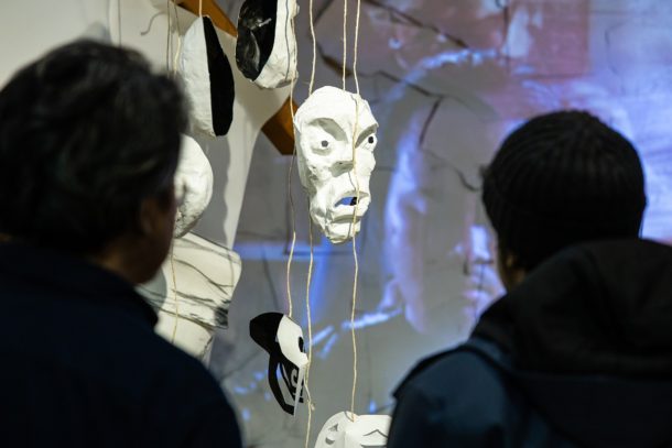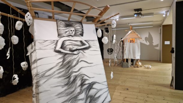 We are going to look at his installation. The first part, an assemblage of a sleeping man lying in a sloping upward bed, half sunk in the ground, drawn in charcoal. On the left and right hang various white masks. The work is called ‘You realize? I am you’. It is about how your identity can change in a social situation, in other circumstances and how we sometimes lose ourselves under the weight of expectations. The masks were made by various people in groups. “How do you see yourself from the inside? Not externally but internally?” At the back is a drying rack with clothes, often black, bears can also be seen. “You can’t lose everything, a part of your existence remains.”