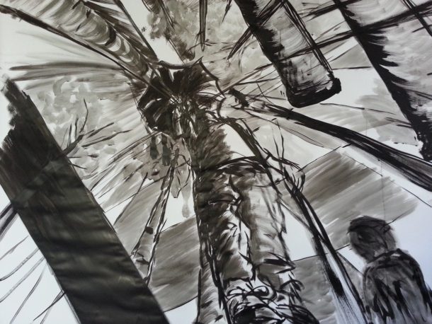 I speak to Elvis at one of the tables in Stroom’s large reception area. He has laid out a number of images of artworks on the table to illustrate his story. In front of me, I see a large drawing in which an empty space is central. On the bottom, a soft line can be seen that suggests the ground, where only a pair of slippers have been left behind, like silent witnesses to someone’s presence. At the top, a winter melon plant (white pumpkin), a kind of gourd, winds its way. The floor is strewn with dozens of folded paper shapes, like fallen leaves. Next to it is another drawing made with Indian ink, from a dramatic perspective that looks up at a group of imposing trees or structures. In the play of light and shadow, a figure stands in the foreground.