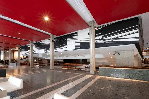 This play of lines is based on a study of the architecture, space and function of the Main Hall (Grote Zaal) of the Doelen. The reverberation of the sound in that same Main Hall has also been taken into account. For example, the four central black shapes are aimed at the position of the stage – the source of music during a concert. The black shapes on the left and right are in line with the acoustic wall panels that reflect the sound on the sides of the Hall.
