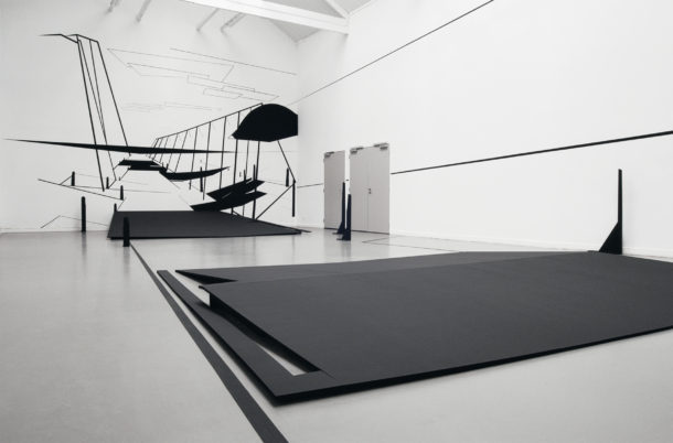Another key work is Snatch, which she made in 2006 for the Fridericianum in Kassel (was on display from 14.05. – 25.06. 2006). A spatial mural with a sloping wall built for it in the hall. The wall was only there during the period of the exhibition. This applies to many of her works, that they are not permanent. That is why documentation in the form of models and photographs is very important to her. Another work that is no longer on display is the mural Clash (was on display from 13.01. – 25.01. 2007) in the Van Abbe Museum (2006). “The space in the Van Abbe was black at the time. I painted it white on black.”