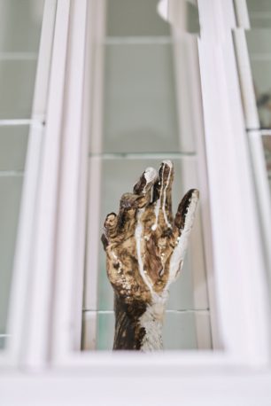 What she also discovered at the Rijksakademie is ceramics. She started scanning hands and printing them onto clay. She succeeded for the umpteenth time. She had the printing done at the clay workshop. ‘What poses do hands take?’, she wondered. She looked at the hands of Greek statues. She examined the hands of her beloved friend and stilled that in ceramics. He has quite large hands, I see. It looks like wood, also because of the colour. You can feel it best with your eyes closed, she says, following Matisse who said ‘When I close my eyes, I see things better than with my eyes open.’
